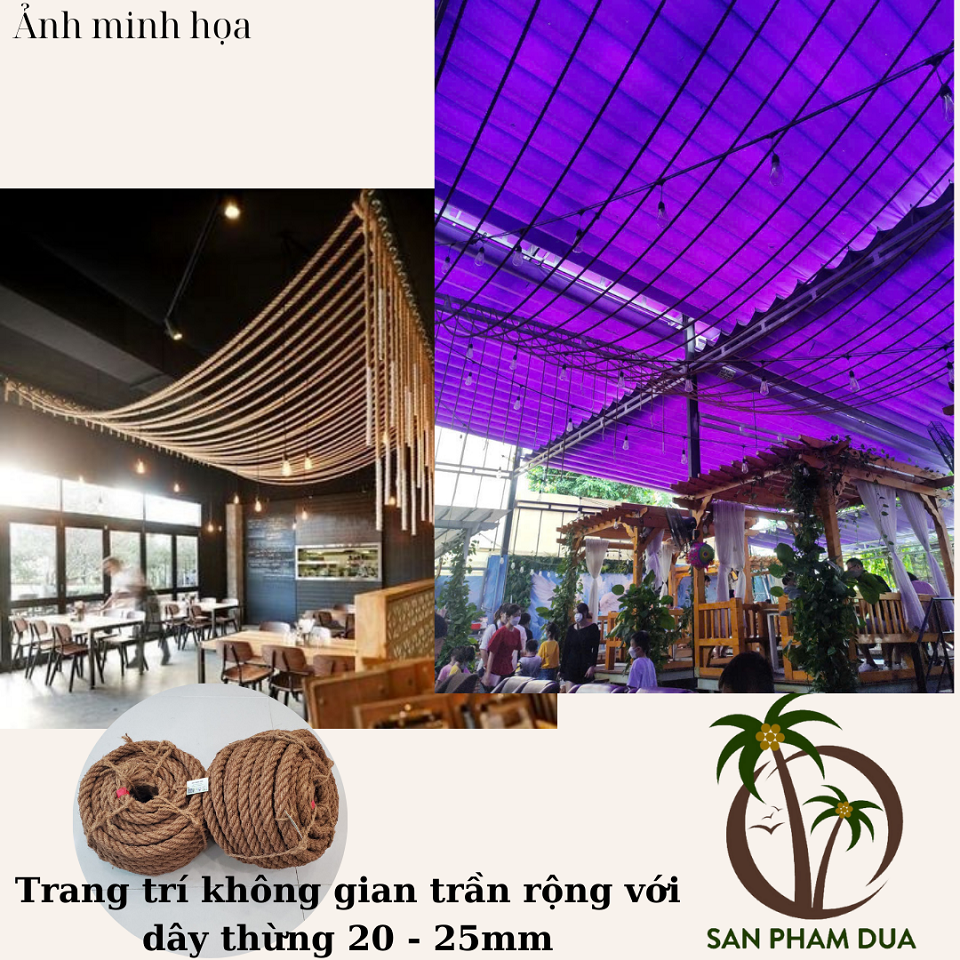 Dây thừng 20mm, 25mm, 30mm và 40mm dùng trang trí các bối cảnh thả trần trong trang trí quán cà phê, nhà hàng, resort; làm dây đèn thả trang trí, làm dây thừng hàng rào, lang can; dây thừng xích đu,..